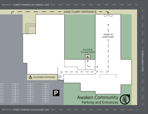 You can enter the building through the parking lot entrance off of Iglehart Ave, or the sanctuary entrance off of Carol Ave.